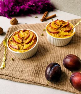 Następnie wbij jajka, dodaj wszystkie przyprawy, orzechy i śliwkę pokrojoną w kostkę. Możesz podzielić owsianę jak ja – na 2 naczynka lub upiec w jednym, większym.